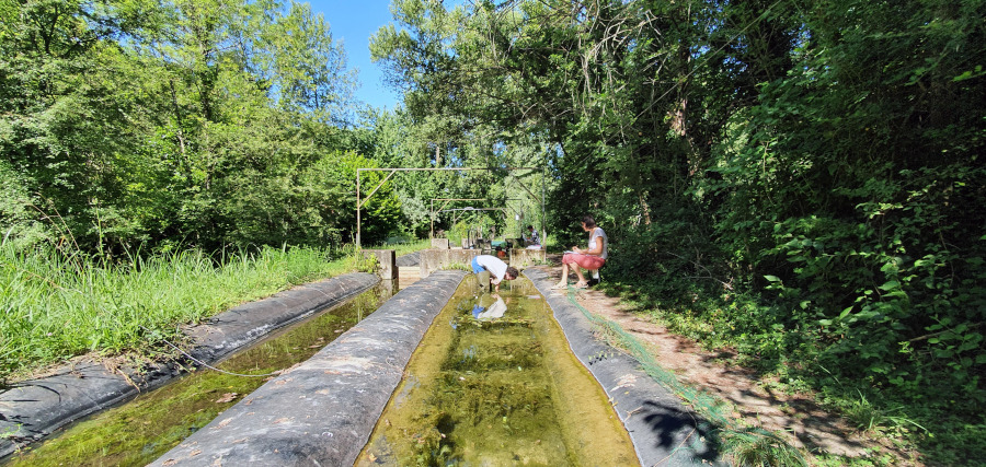 Culture en lignes des espèces de plantes aquatiques en conditions semi-naturelles dans une rivière artificielle.